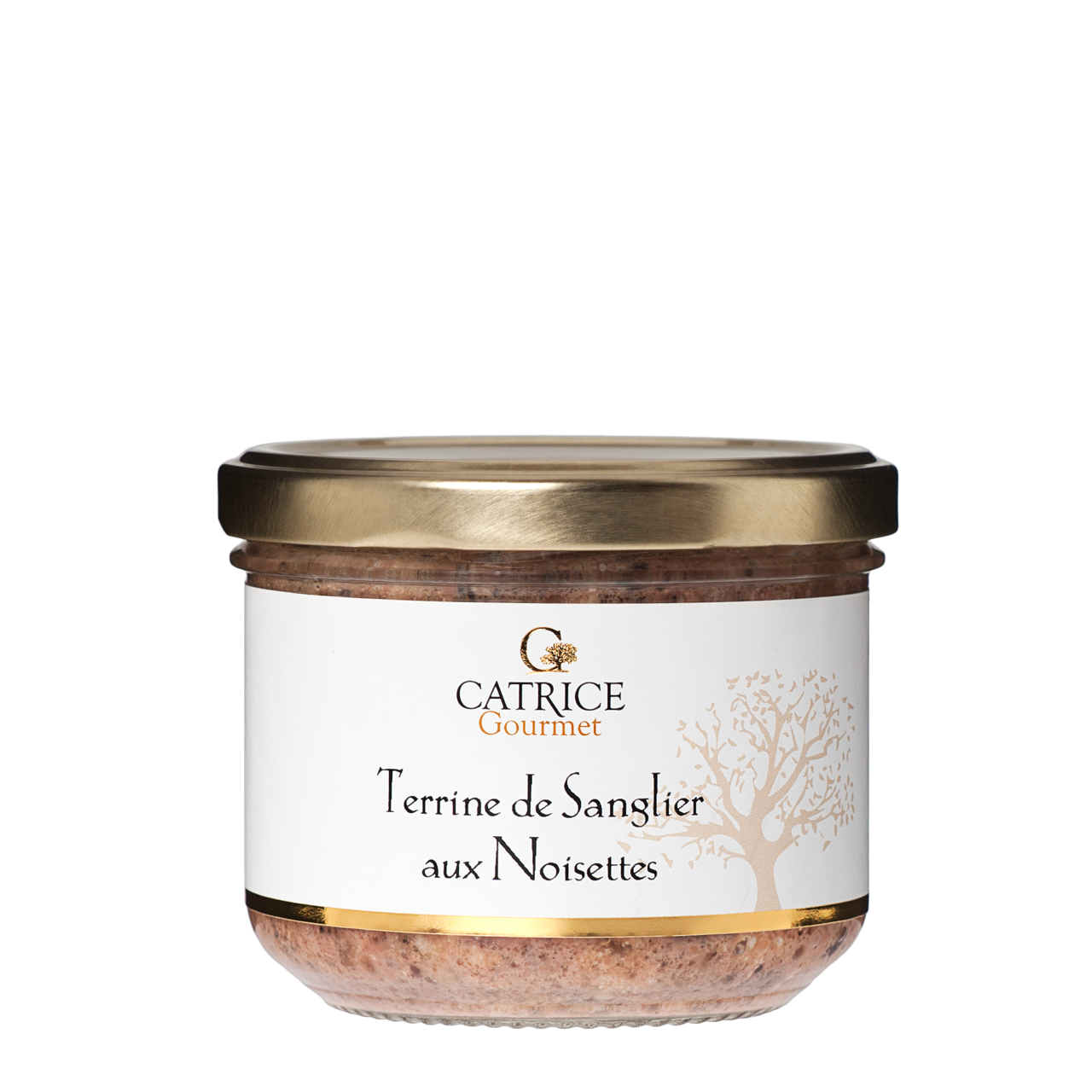 Ingredients : wild boar 27.70% (France/UE), pork (France), pork liver (France), eggs (EGGS), water, onions, hazelnuts (NUTS) 2.77%, wine (SULPHITES), flour (GLUTEN), salt, pepper